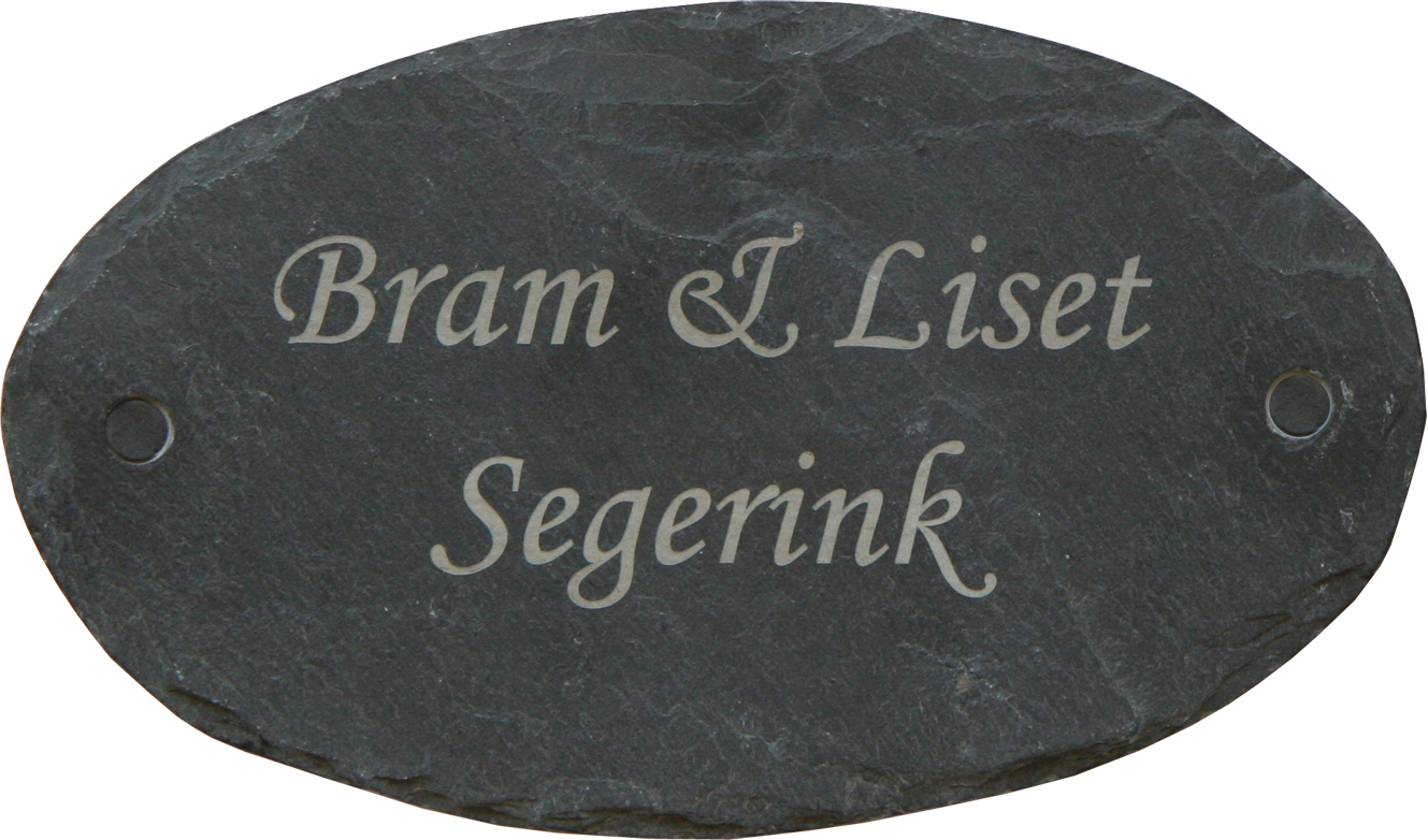 Leisteen is een zeer exclusieve natuursteen welke uitstekend geschikt is voor gebruik in en rondom uw woning. Leisteen wordt gewonnen in open groeven en mijnen. Het ontstaat uit klei die onder druk in de loop van vele jaren omgevormd wordt tot leisteen. De steen is sterk gelaagd en grijs/zwart van kleur. In de groeve worden schollen steen van de rots gespleten. Hierdoor ontstaat een natuurlijk splijtoppervlak en ruwe afgebrokkelde randen. Onze leisteen naamborden hebben door dit ontstaansproces een onregelmatig uiterlijk. Elk leisteen naambord is gelaagd en heeft een afgebrokkelde rand. Elk leisteen naambord is daardoor, hoewel dezelfde afmeting, toch steeds weer anders, uniek! Leisteen is slijtvast, maar kan aan de randen afschilferen. Door het robuuste uiterlijk wordt dit in de praktijk niet als storend ervaren. De tekst wordt in alle leisteen naamborden door middel van lasertechniek gegraveerd, waardoor uw naam niet weg kan slijten of vervagen. De gravure in leisteen wordt creme-grijs van kleur (met uitzondering van de 2511 t/m 2514). Alle leisteen naamborden zijn voorzien van schroefgaten en worden compleet met bevestigingsmateriaal geleverd. De schroefkoppen kunt u afdekken met de bijgeleverde zwarte afdekviltjes.
