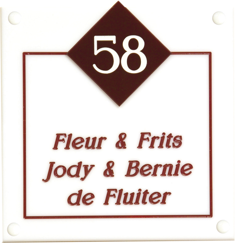 Perspex is een stevige kunststofsoort (3 mm dikte), welke uitstekend geschikt is voor gebruik in en rondom uw woning. De tekst wordt in alle perspex-naamborden gegraveerd, waardoor uw naam niet weg kan slijten of vervagen. De transparante perspex naamborden worden aan de achterzijde ingegraveerd (waardoor de voorkant glad blijft) en de gekleurde perspex naamborden worden aan de voorzijde ingegraveerd. Tot slot: de perspex-naamborden zijn standaard voorzien van schroefgaten (tenzij anders vermeld) en worden geleverd met afstandbusjes en afdekdopjes waardoor u het naambord eenvoudig op een korte afstand van de muur kunt monteren.
